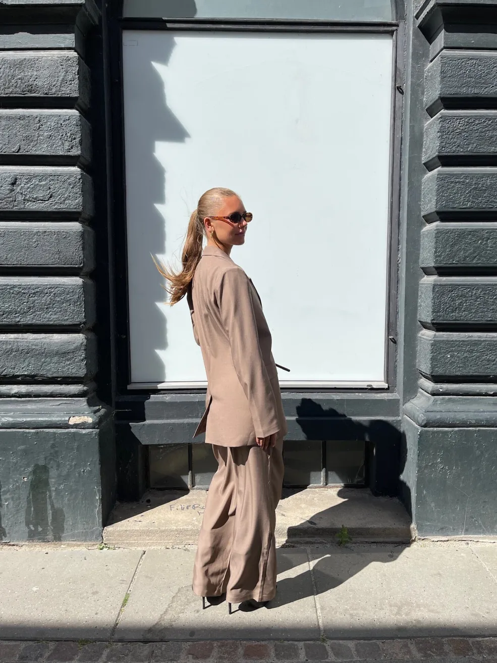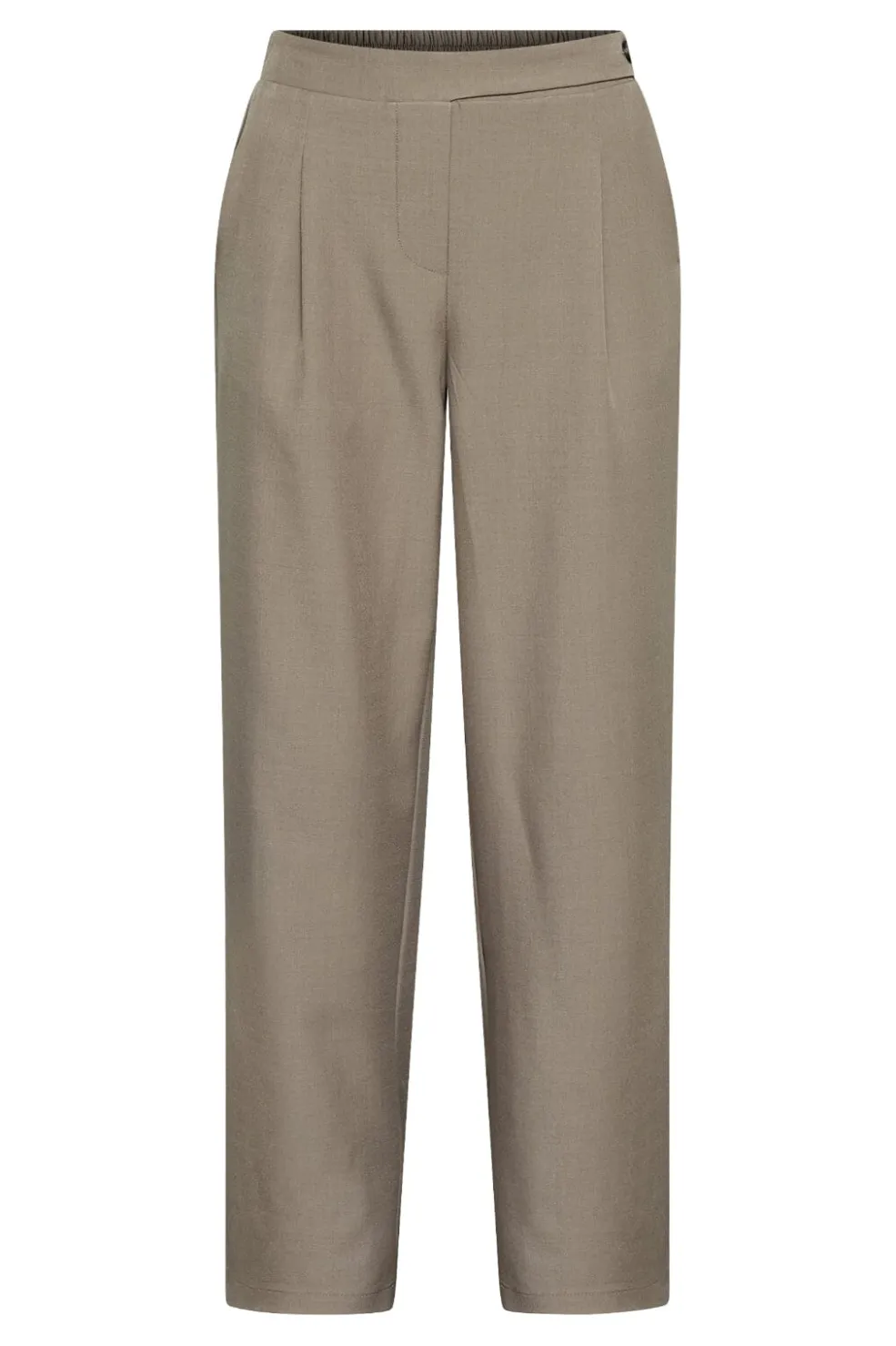 Bukser fra Sisters Point i en sandfarvet melange-nuance. Bukserne har en høj talje, løs pasform og en gulvlang længde med pressefolder foran.