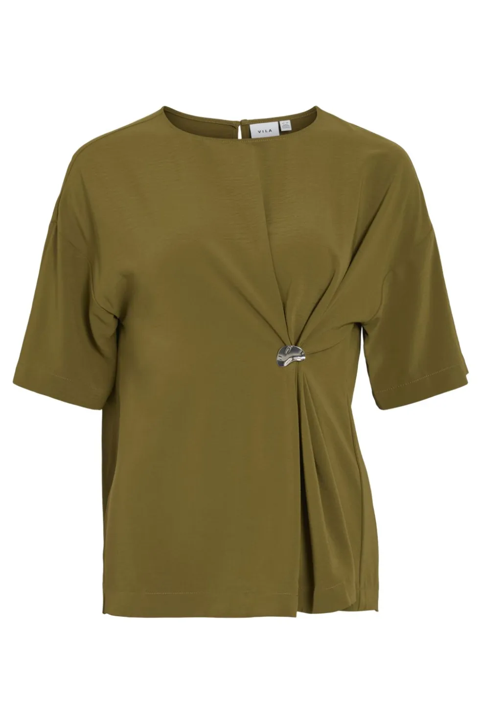 Mørkegrøn top fra Vila med rund halsudskæring. Toppen har en dekorativ knudedetalje med metalaccent og korte ærmer. Den er fremstillet af delvist genanvendt materiale.