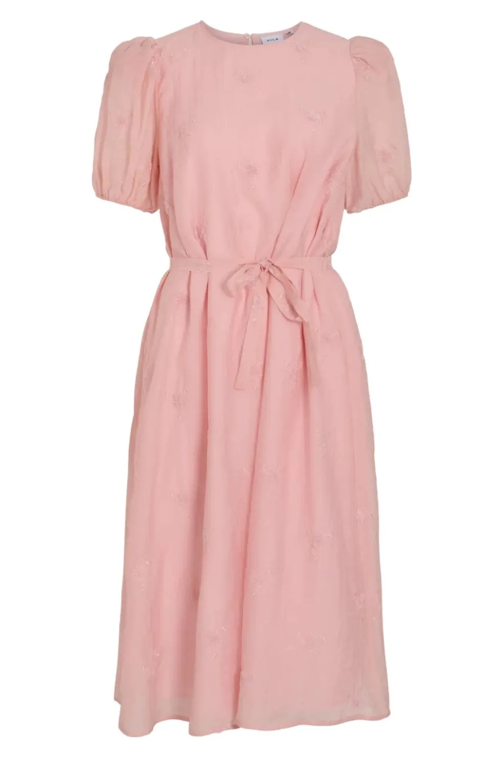 Lyserød midi-kjole fra Vila med broderede detaljer. Kjolen har puffede ærmer og et bælte i taljen, der fremhæver silhuetten.