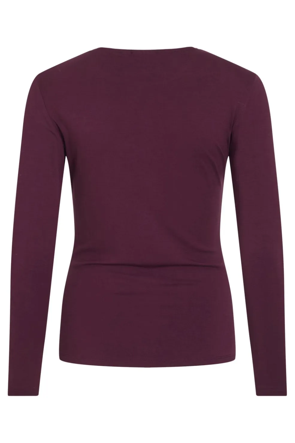 Bordeauxfarvet langærmet top fra Vila med rund halsudskæring. Toppen har draperede detaljer på fronten og en tætsiddende pasform.