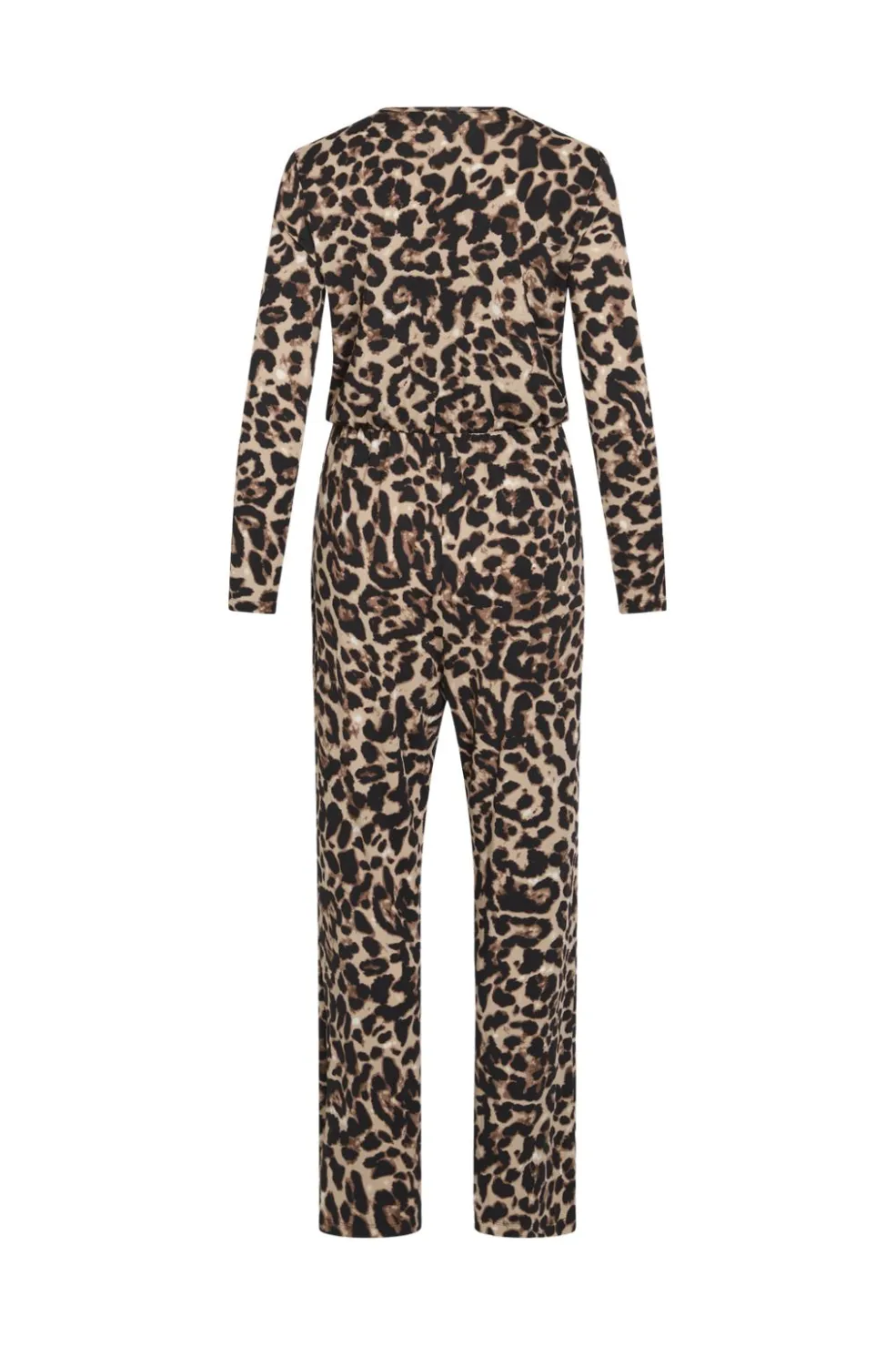 Jumpsuit fra Vila i leopardmønster med beige, sorte og brune nuancer. Den har lange ærmer og V-udskæring med bindebåndsdetaljer, der giver et flot fald.
