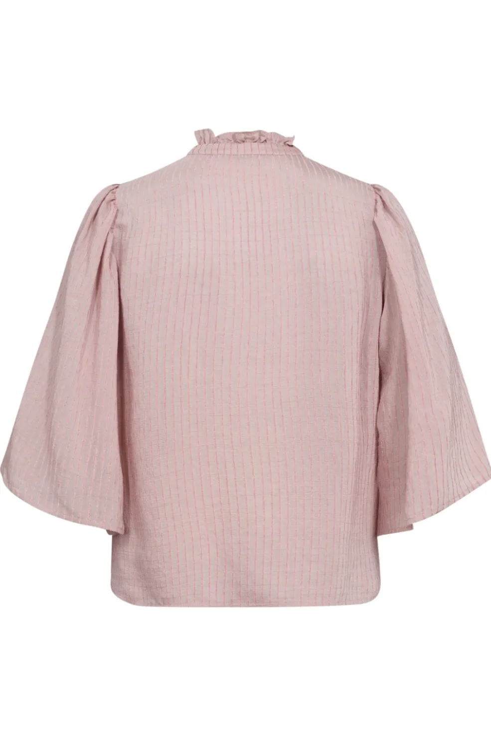 Lys pink skjorte fra Co’Couture med striber og rynket høj hals. Skjorten har 3/4 ærmer og knaplukning foran. Stoffet har en let tekstur, der fremhæver det stribede mønster.