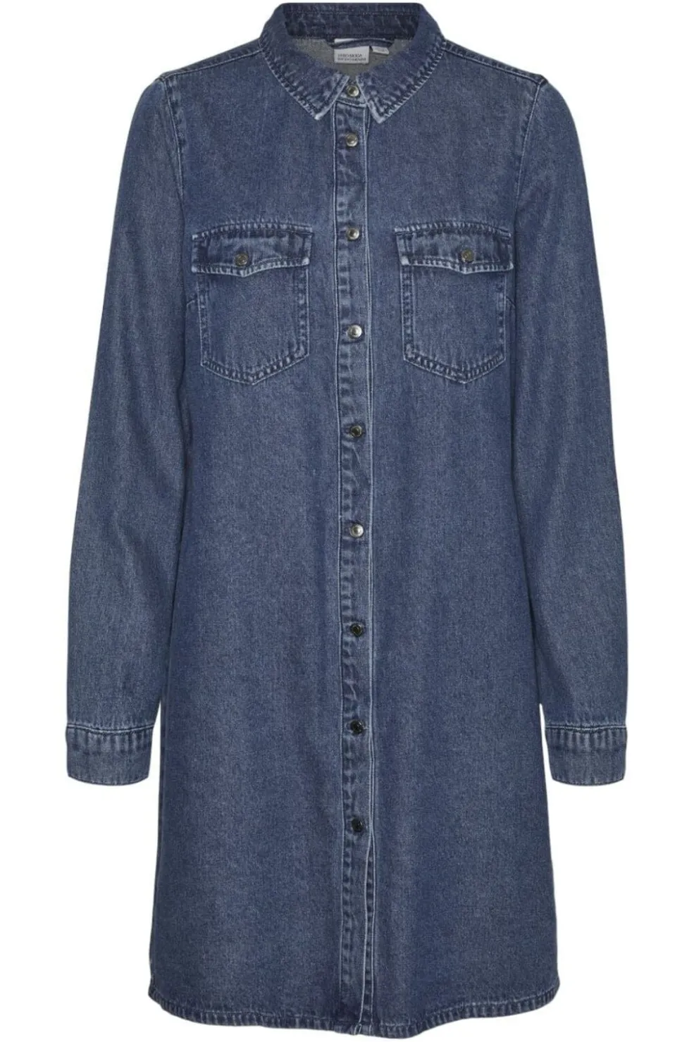 Denimkjole fra Vero Moda i mellemblå denim. Kjolen har skjortekrave, lange ærmer og knapper hele vejen ned. To brystlommer giver kjolen et praktisk præg.