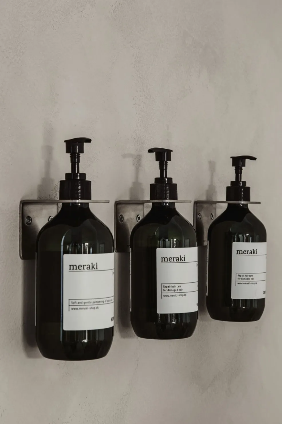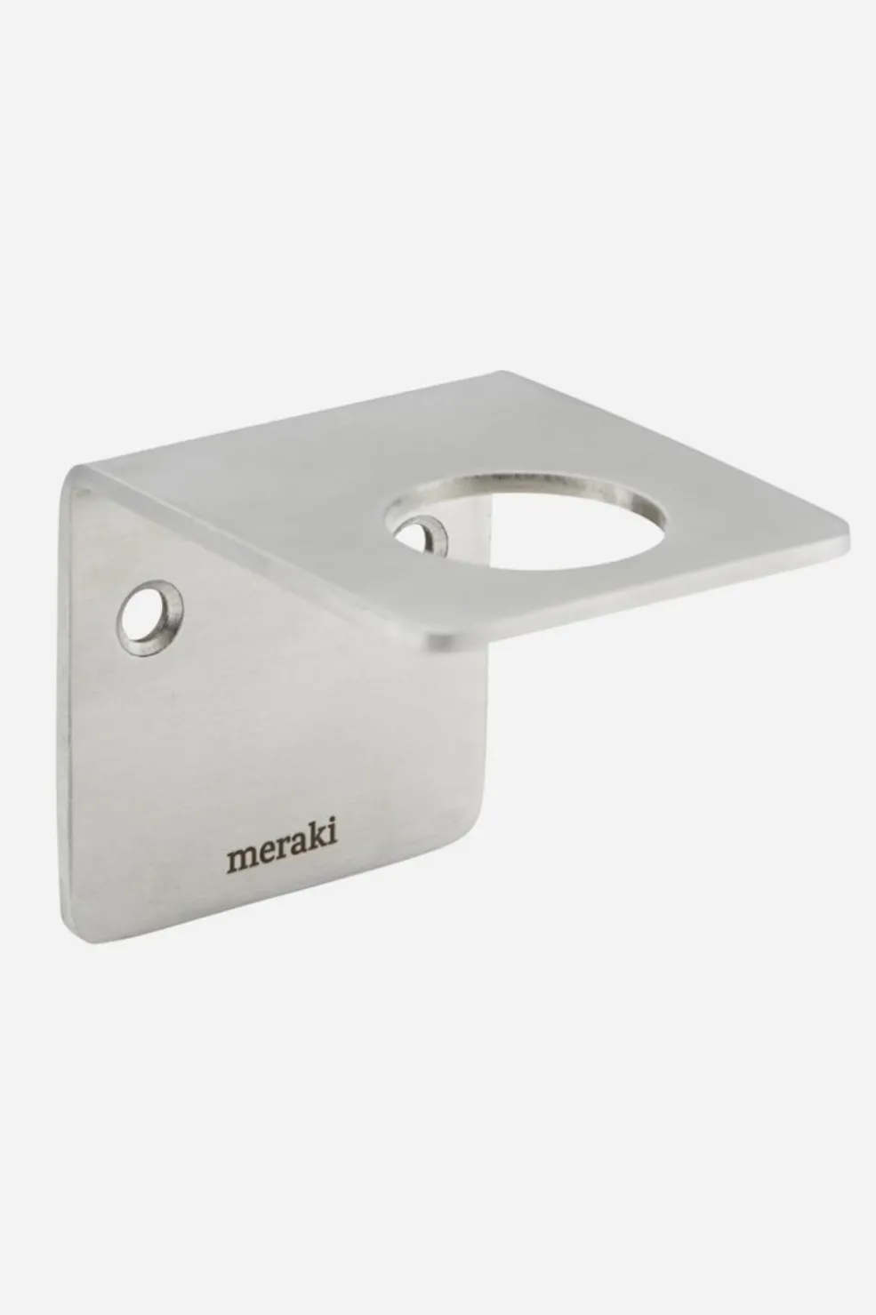 Meraki Vægophæng Supply i en brushed silver finish – et dekorativt vægophæng, der kan bruges som sæbeholder af flasker med pumper. De passer blandt andet til Merakis 275 ml. og 490 ml flasker.