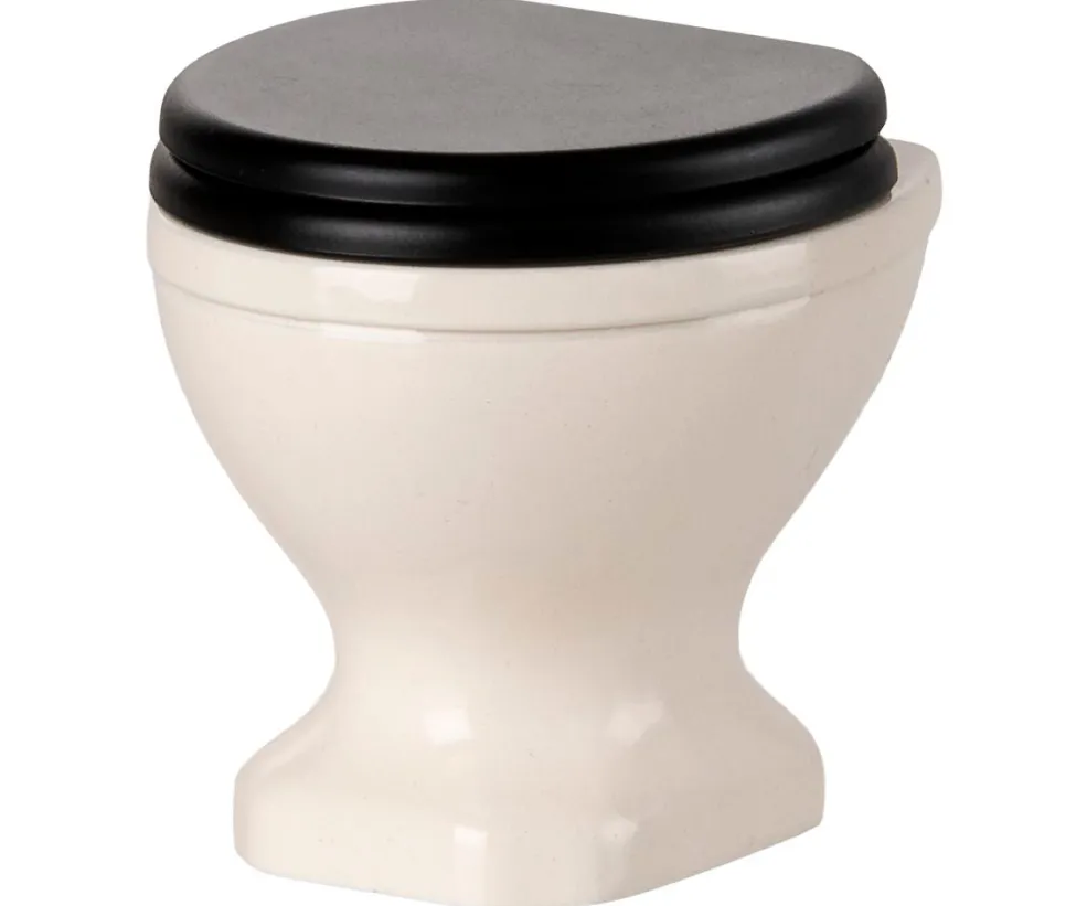 Et miniaturetoilet fra Maileg med råhvid base og sort toiletsæde. Designet til musfigurer i en miniatureverden.