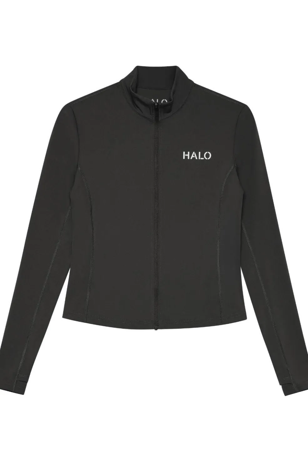 En zip-jakke fra Halo i mørk grøn farve. Jakken har lange ærmer, høj krave og lynlås hele vejen op.