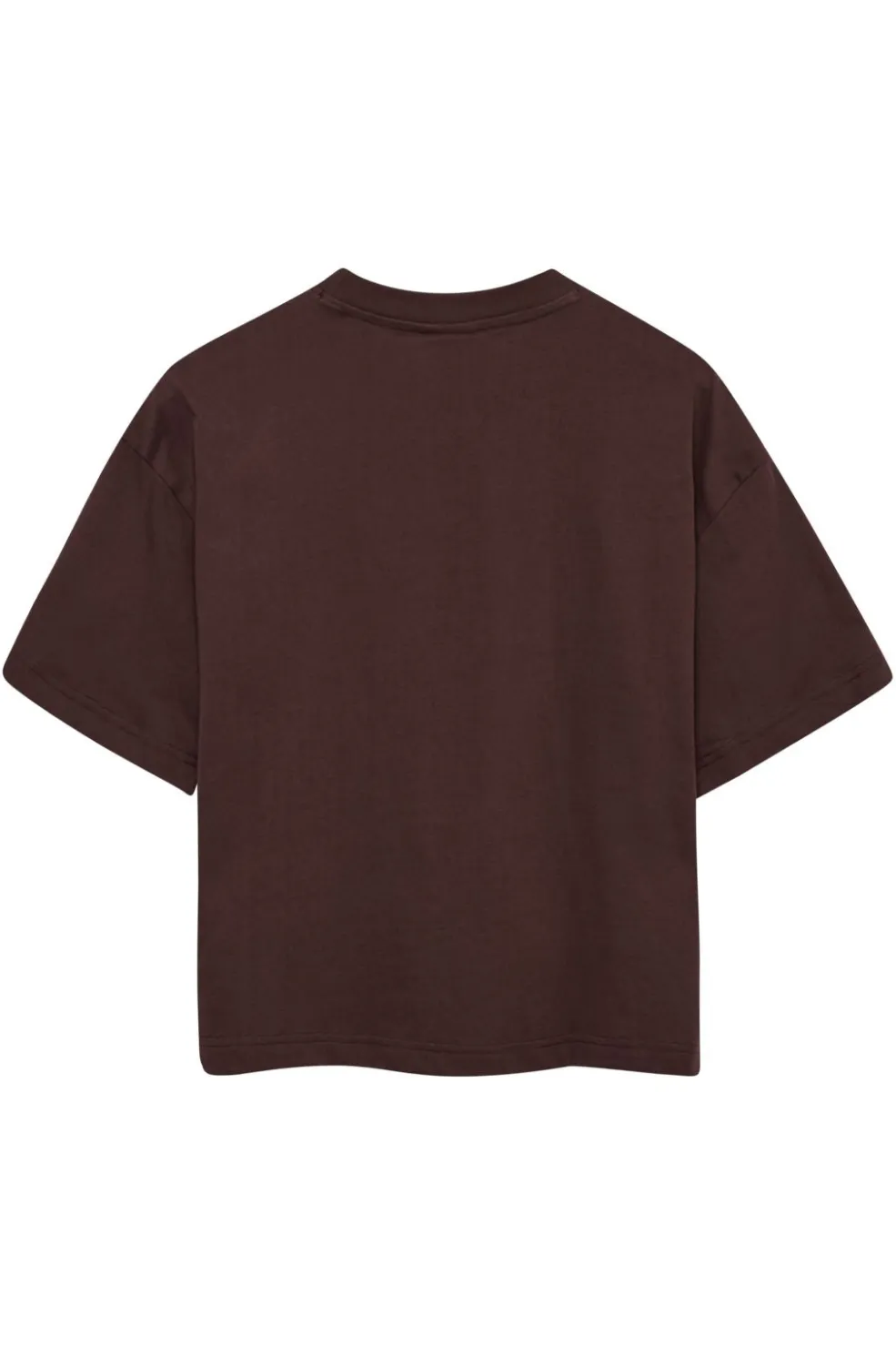 T-shirt fra Halo i mørkebrun, lavet af 100 % økologisk bomuld. T-shirten har et broderet HALO-logo og en løs pasform.