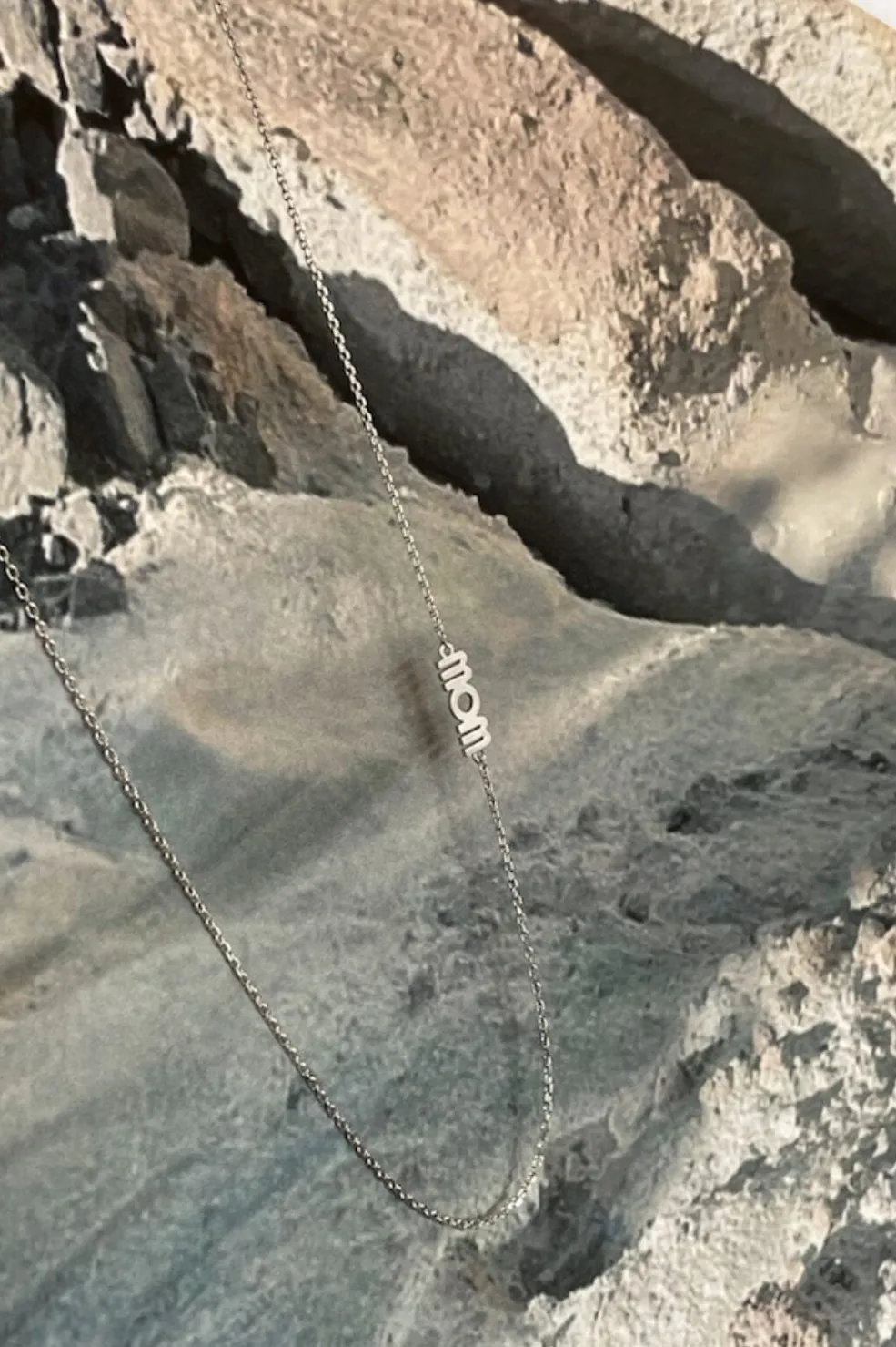 Sølvhalskæde fra Stine A med mom-vedhæng. Den tynde kæde er lavet af 925 sterling sølv med et enkelt design, hvor ordet mom er placeret asymmetrisk på kæden.