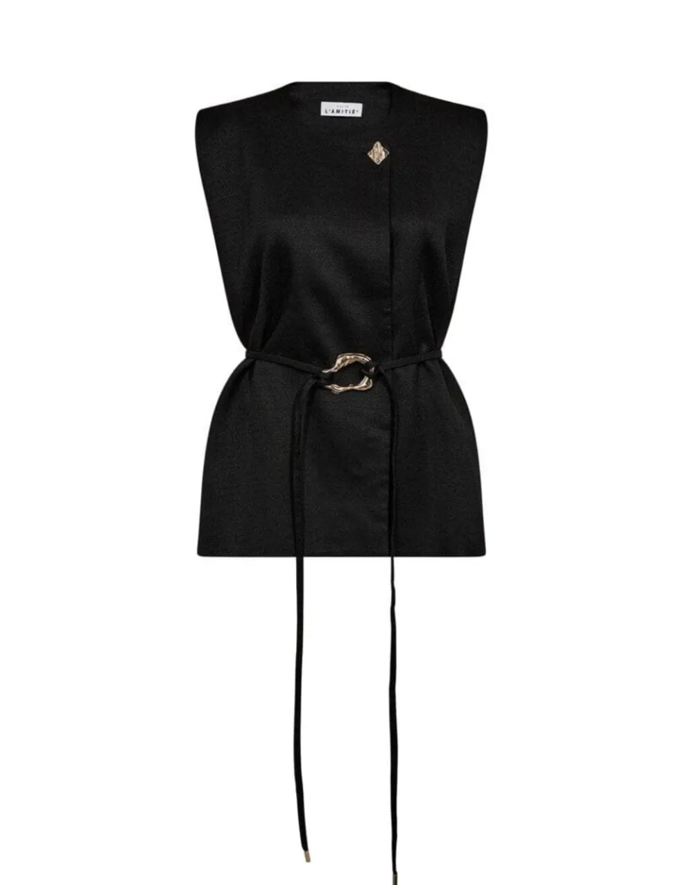 Sort vest fra Haute L’Amitié med rund hals og justerbar lukning. Vesten har en almindelig pasform og passer til både formelle og festlige lejligheder.