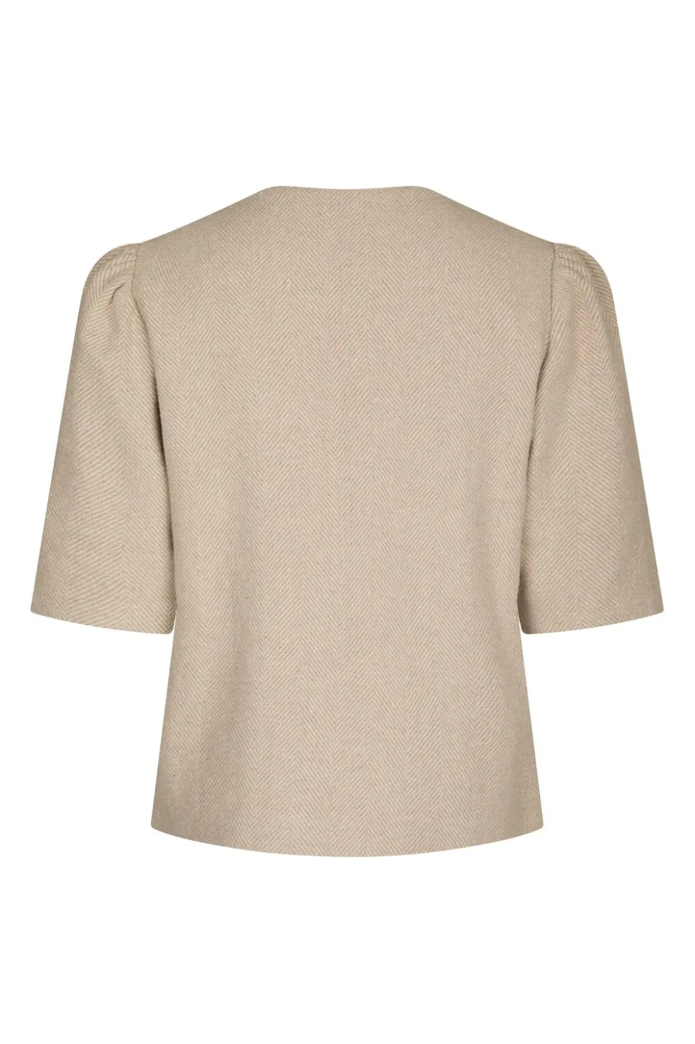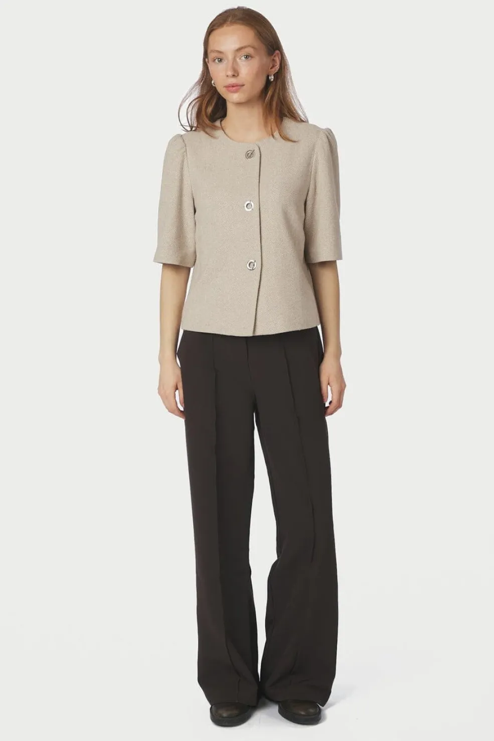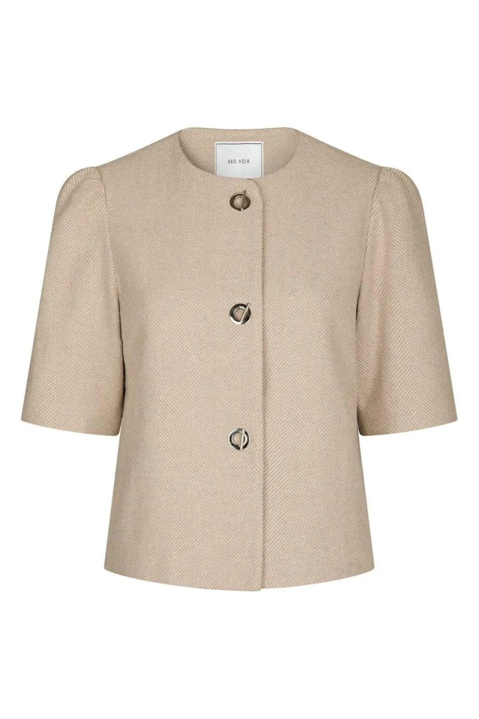 En sandfarvet blazer fra Neo Noir med herringbone-mønster. Blazeren har korte ærmer, rund halsudskæring og tre runde metalknapper.