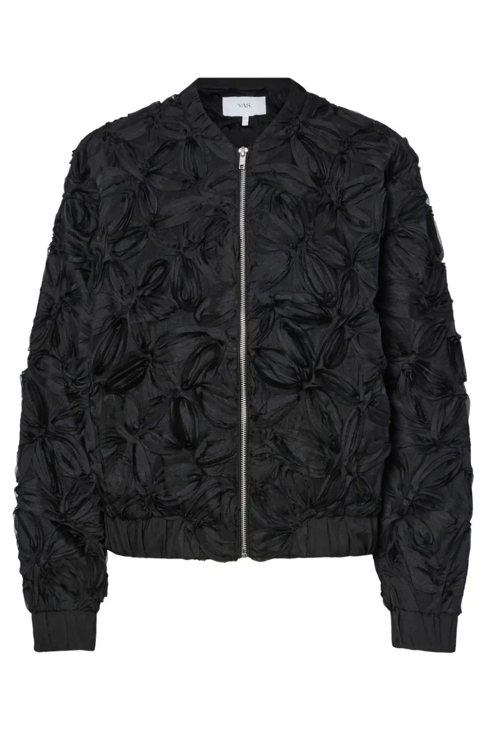 Sort bomberjakke fra Y. A.S med jacquardvævet blomstermønster. Jakken har en O-hals og lange ærmer med elastiske manchetter.