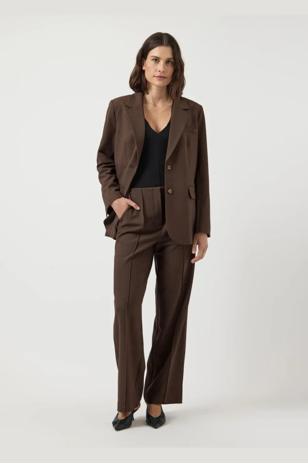 Chokoladebrun blazer fra YAS, lavet af en polyesterblanding. Blazeren har to knapper foran og lommer med klap.