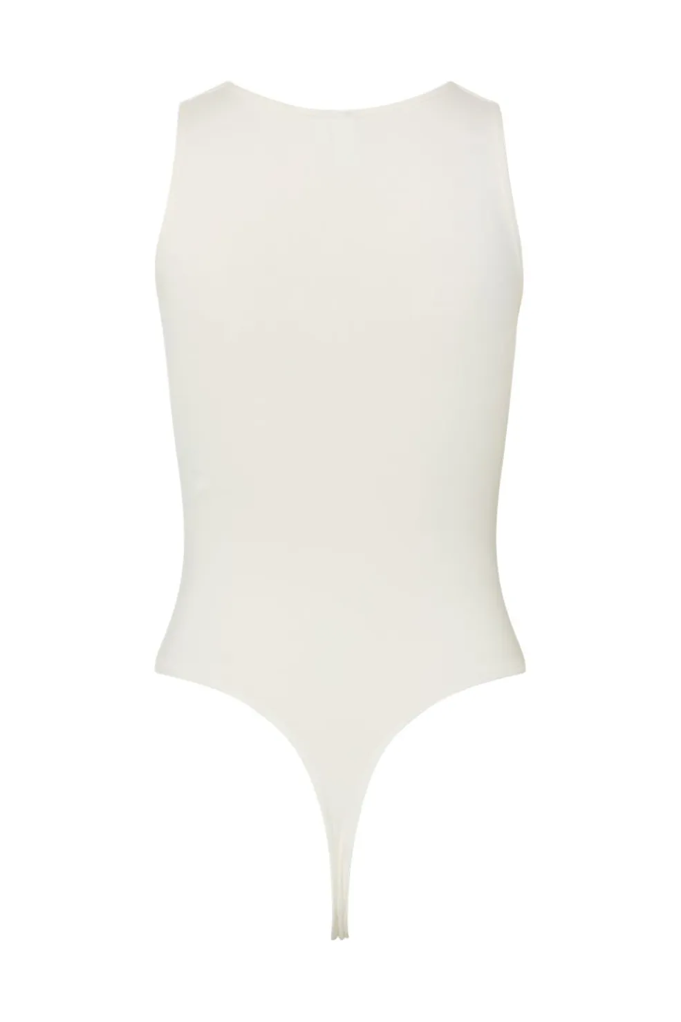 Hvid body fra Y. A.S i jerseymateriale med stræk. Bodyen har en rund halsudskæring og et ærmeløst design med en kropsnær pasform.
