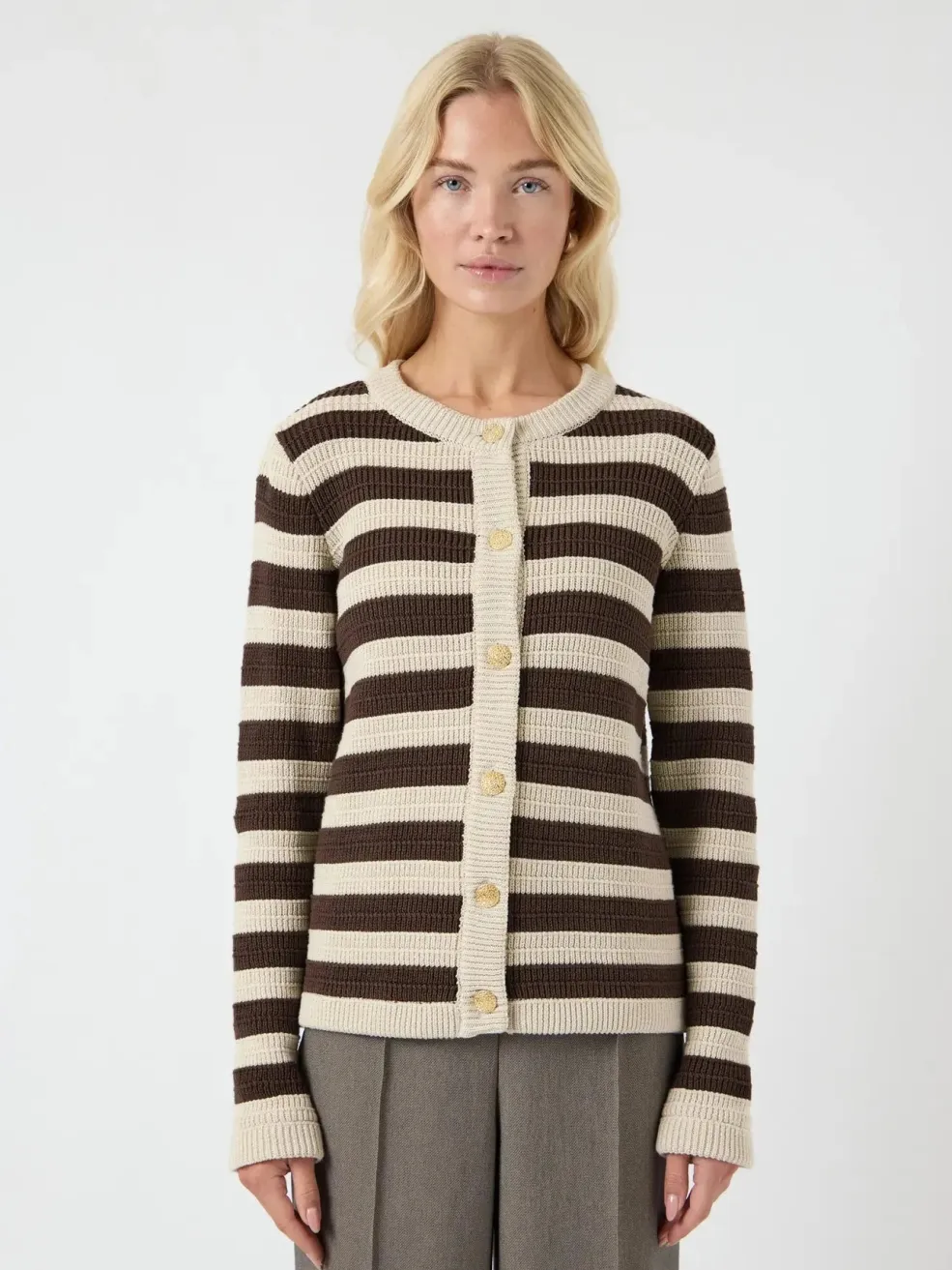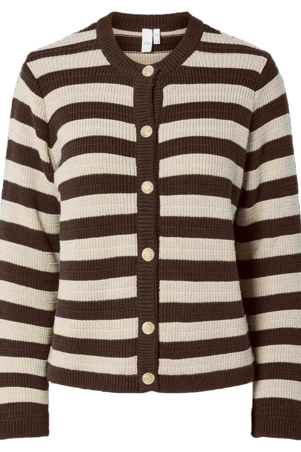 Strikket cardigan fra Y. A.S med horisontale striber i chokoladebrun og beige. Den har rund halsudskæring og gyldne knapper foran.