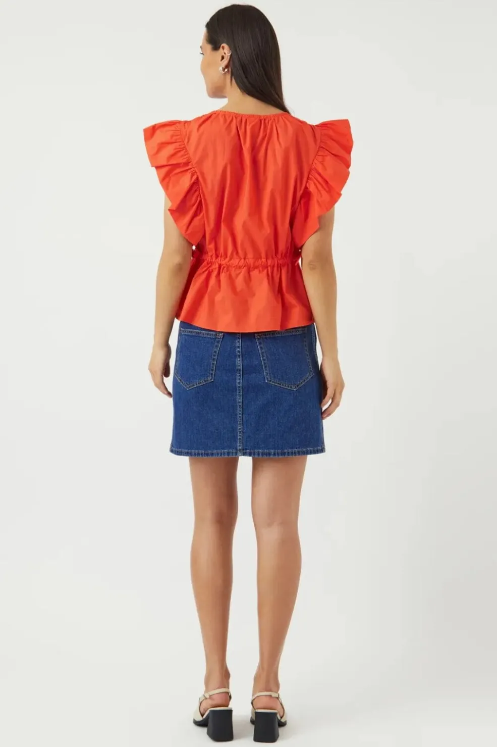 Rød top fra Y. A.S med V-halsudskæring og flæsebesatte ærmer. Toppen har en samlet talje og en regular pasform, der giver god bevægelsesfrihed.