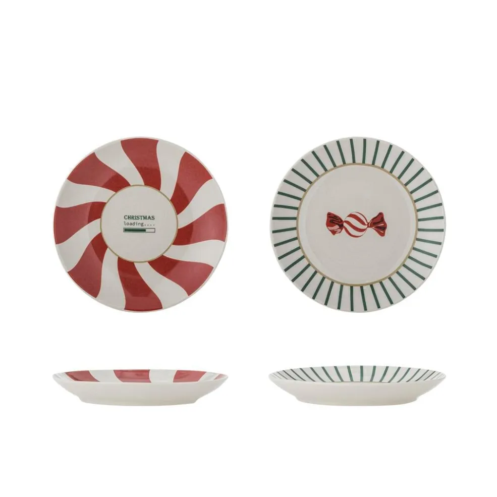 Juletallerkener fra Bloomingville i stentøj med rødt spiralmønster og grønne striber. To forskellige designs med julemotiver på hvid baggrund.