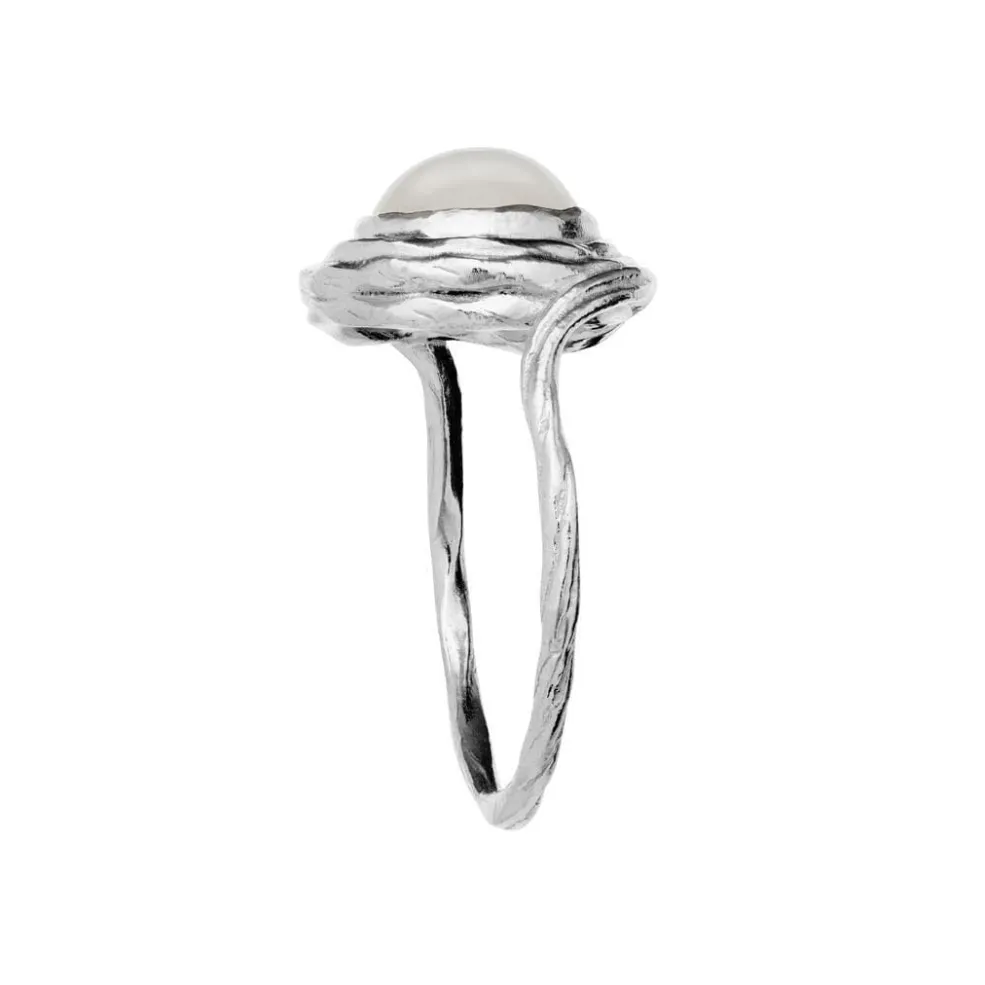 Sølvfarvet ring fra Maanesten med en rund hvid månesten i midten. Ringen har et bølget bånd med en organisk tekstur og små hvide zirconia-sten omkring månestenen.