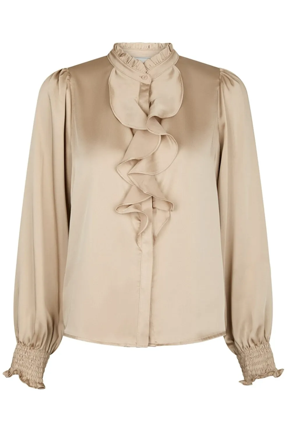 Bluse fra Neo Noir i lys sandfarve, lavet af 100 % polyester. Blusen har flæser ned langs fronten og smock-detaljer ved manchetterne.