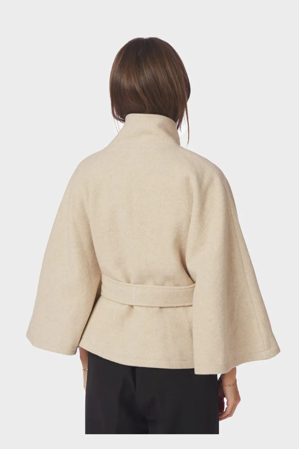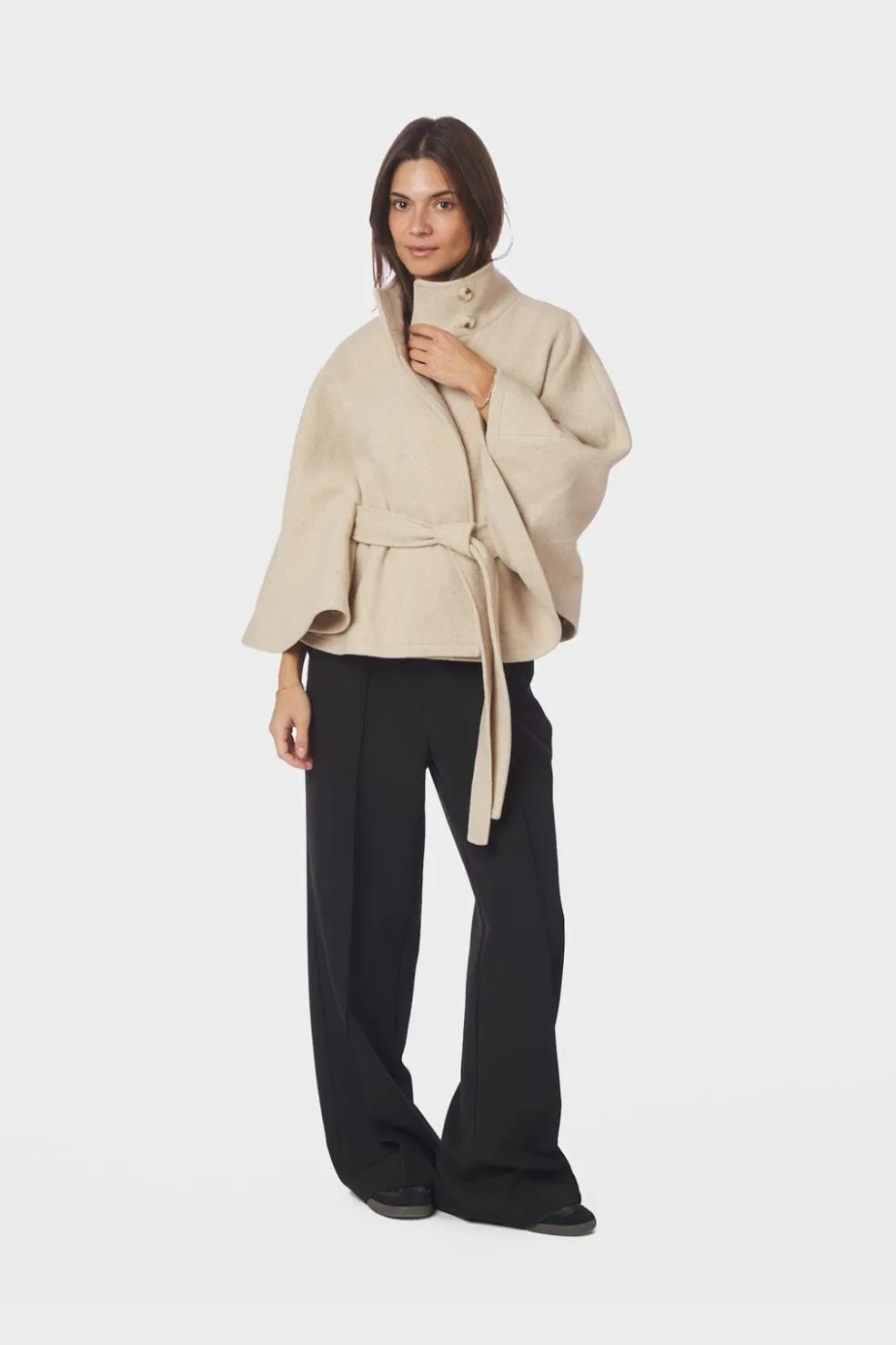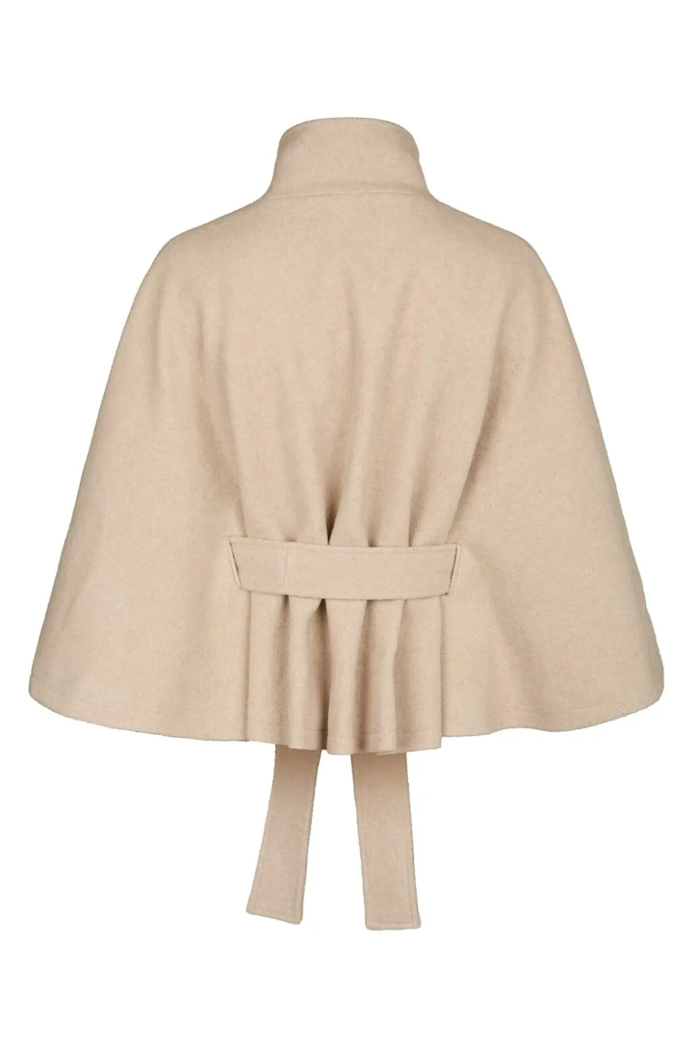 Sandfarvet cape fra Neo Noir med brede ærmer og høj krave. Den har to knapper ved halsen og et bindebånd i taljen, der giver mulighed for at justere vidden.